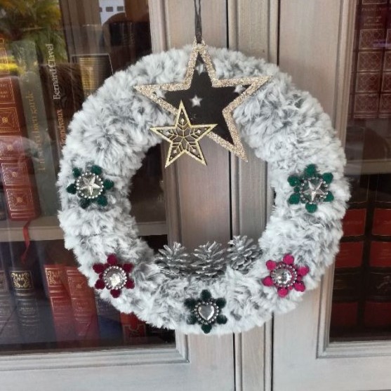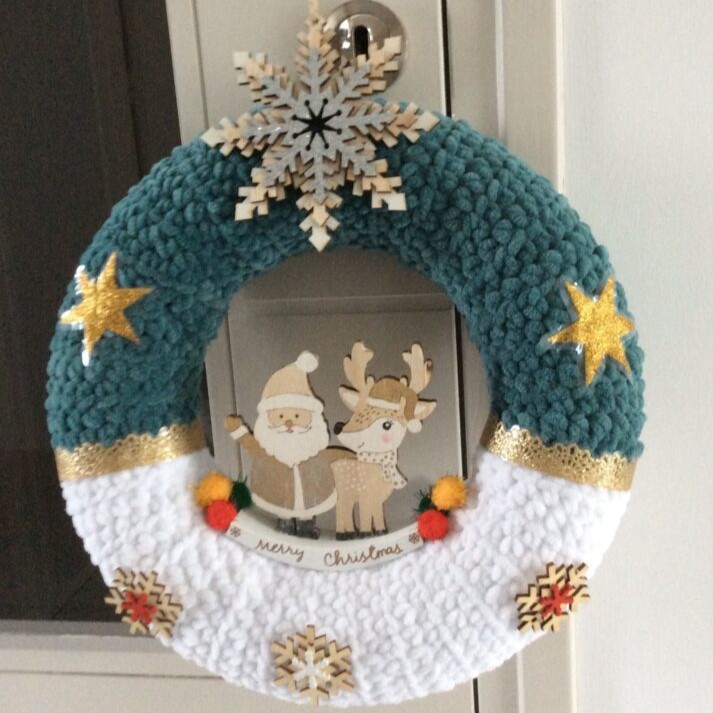 A cette occasion, j’aurais le plaisir de vous proposer des couronnes de Noël confectionnées sur la base de couronnes en polystyrène et recouvertes d’un bandeau de crochet en laine « velours » pour un rendu plein de douceur.